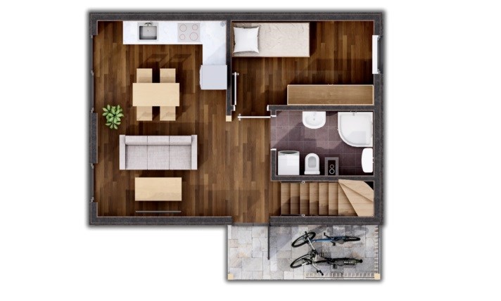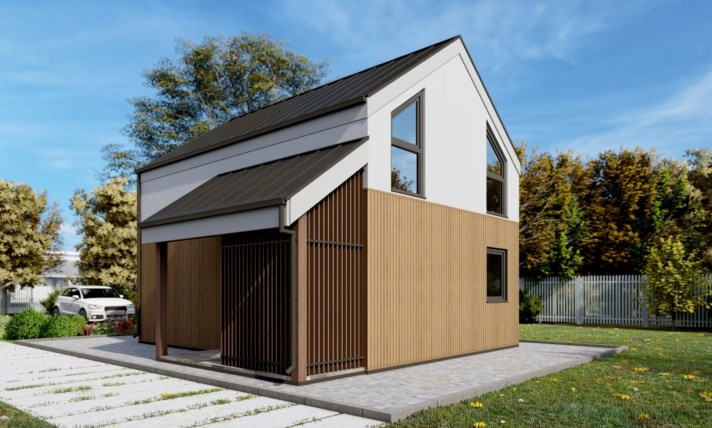 Dom wyróżnia się nie tylko funkcjonalnością, ale także estetyką, z nowoczesną bryłą i prostymi liniami, które nadają mu elegancki wygląd. To idealny wybór dla osób szukających małego, ale dobrze zorganizowanego domu, który łączy w sobie nowoczesny design z wygodą codziennego życia.