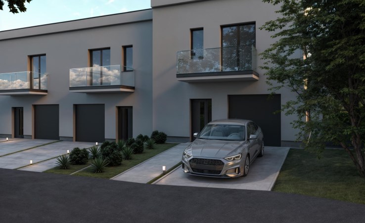 Zapraszamy do obejrzenia niewielkiego budynku mieszkalnego z garażem w trakcie budowy w kompleksie zabudowy szeregowej 3 budynków.