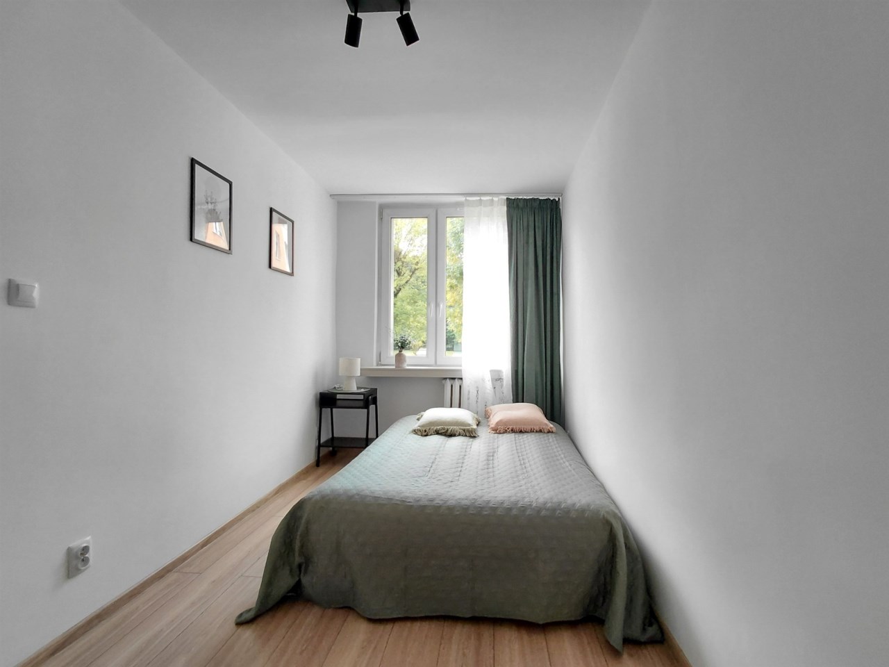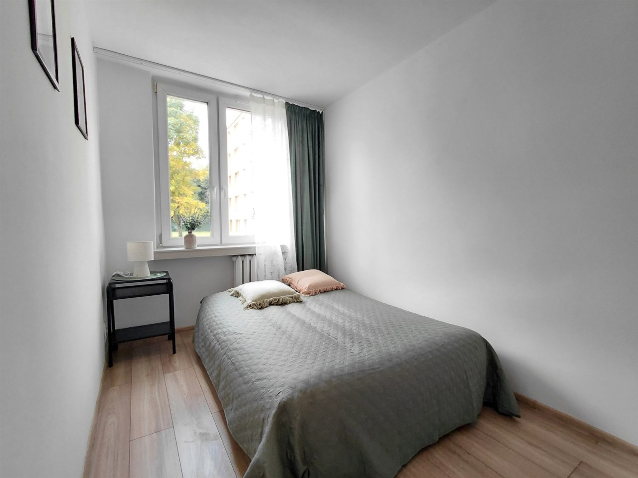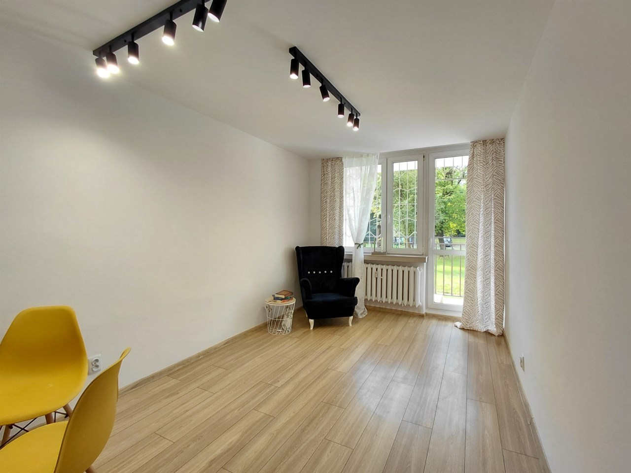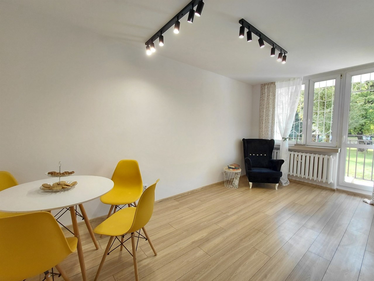 mieszkanie słoneczne, z widokiem na zielony i zadbany teren wokół budynku.