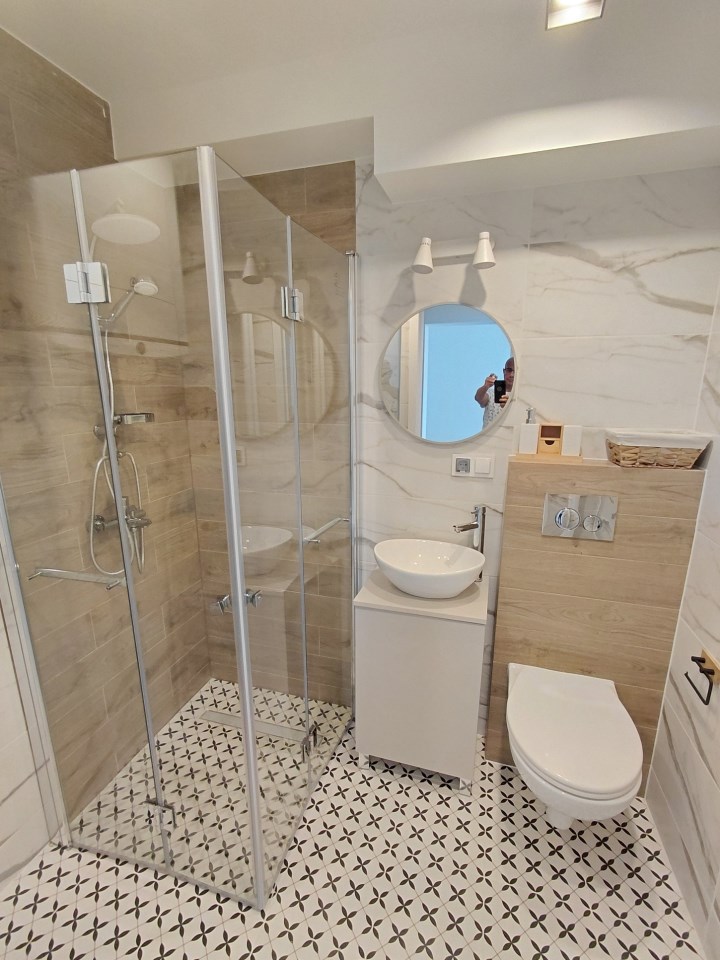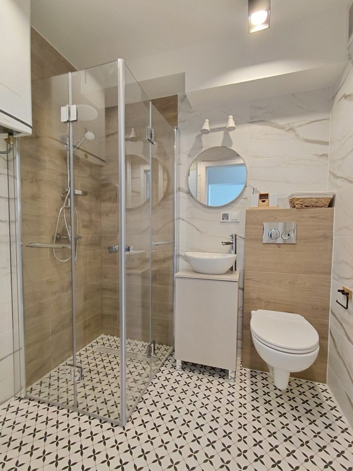 łazienki z kabiną prysznicową i nową armaturą.