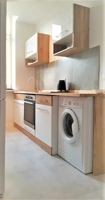 Dodatkowo w mieszkaniu znajduje się praktyczny kącik gospodarczy z pełnym wyposażeniem (m.in. deska do prasowania, żelazko, suszarka, mop i akcesoria do sprzątania).
