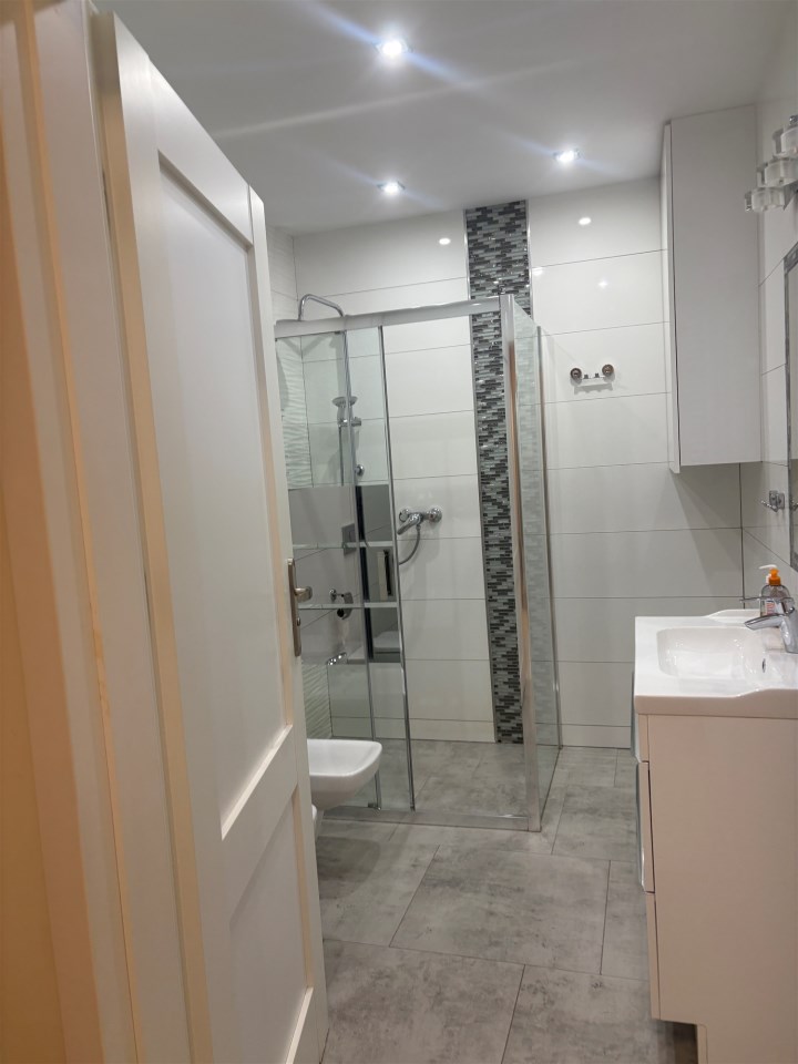Ogrzewanie podłogowe , piec gazowy dwufunkcyjny, w łazience dodatkowy grzejnik typu drabinka, kabina prysznicowa z odpływem liniowym.