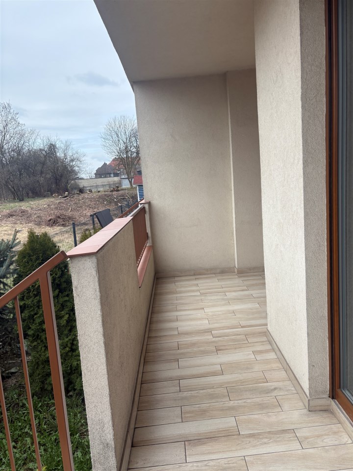 Z salonu wyjście na duży wzdłuż całego mieszkania, wykafelkowany taras (o powierzchni 17,5 m2), z tarasu zejście po kilku schodkach na mały ogródek.