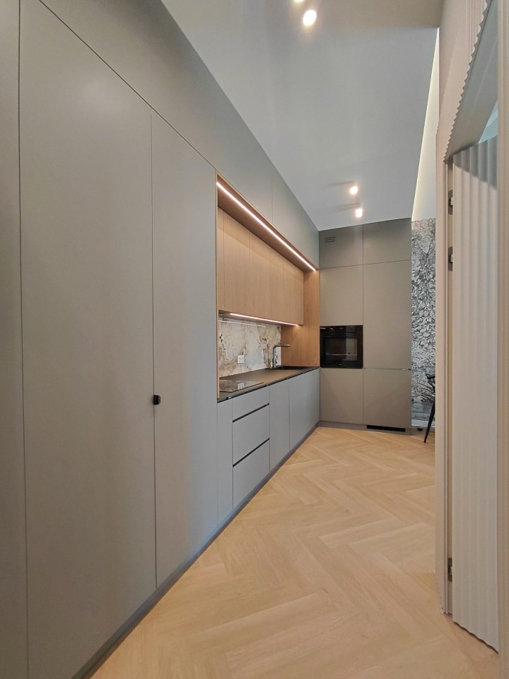 Zabudowa na wymiar w całym mieszkaniu – akrylowe fronty, płyty Egger, wodoodporne blaty kompaktowe.